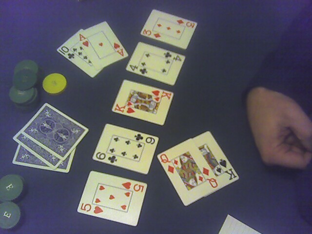 ![]() Recap A New Champ is CrownedTonight's Winner was Shelly Moffat. This was her second in-the-money finish and first tournament championship. She outlasted Larry Knight who has made a habit of making it to the heads-up finish. Reggie Douglas took third and Robyn Cassidy took fourth for her first money finish.Ten bounties were paid, including the odd $5 being placed on Scott, the winner of last month's tournament. Larry eliminated Scott as the last regular bounty, earning $15 for the feat. Lorinda Beals and Nick Lawrence each claimed two bounties, while the remaining bounties were spread out individually. We had 4 new faces at the game - Terence Pritchard and Gayle Miller, Darin Howe, and Jared Warren. Early ActionWe got underway at 7:20 with 3 tables of 7 players each. A few stragglers were blinded in as play started.Save one, all the eliminations prior to consolidation to two tables occurred at the back and TV tables. At the TV table, Shawn was first out at 7:47. Short-stacked, he lost to Darin Howe when Shawn's ![]() ![]() ![]() failed to improve against Darin's ![]() . At the back table, Terence was out next at 8:00 when his ![]() lost to Lorinda's pocket 3s. Nicolas was next out at the main table at 8:13 losing when his flush draw didn't materialize and Reggie's under card Q was paired.The next four eliminations occurred in rapid fashion. At the back table, Stanley and Dan went out back-to-back around 8:35. Robyn rivered Stanley with a flush beating his ![]() . Lorinda busted Dan's pocket aces, also with a flush on the river.Moments later at the TV table, Nick eliminated both Darin and Brian. Nick raised in early position and was called by both Darin and Brian. Nick revealed pocket 8s, Darin pocket 2s, and Brian ![]() . Nick's 8s stood up as the board failed to help anyone.ConsolidationWe went to two tables with 7 players each. Six more players would not make the final table. The first such was Gayle who lost a heart breaker when the flop came with two tens to give her trips, but Jared also had a 10 - with an ace kicker.The host was out next when he was short-stacked and found an ![]() ![]() ![]() to go all-in with. Chad called with ![]() ![]() ![]() , and made a river flush. This just a few minutes after both players agreed that losing to a unexpected flush in this manner is the worst way to go out.Scott was eliminated next and was the aforementioned last bounty. He went all-in pre-flop with ![]() ![]() ![]() . Lorinda called with ![]() . Larry re-raised all-in with ![]() , which Lorinda called. Larry's jacks held up and nearly tripled his previously short stack.Next out was Ken Edmonds. He was short-stacked and went all-in with ![]() against Robyn with ![]() ![]() ![]() . Both a and an came on the board, but the on the flop was all that was needed.Rachel was next out when she was all in with ![]() , but Reggie paired 4s. I suspect that Reggie was the big blind in that he had a in the hole with his .The last elimination before seating the main table was Arlene. She stayed a float for a while going all in twice against Nick, once hitting a river flush and then a river . But her luck ran out against Larry when her ![]() lost to his ![]() when Larry hit a 3 on the river. Most cards would have resulted in a split pot, but Larry lucked out. Again, the underdog won the hand.Final TableIn no particular order, the final table consisted of Reggie, Larry, Lorinda, Robyn, Shelly, Chad, Nick, and Jared.Lorinda was the first out at 10:10 when her ![]() ![]() ![]() were beaten when Jared made a straight. Larry was also in the hand and lost a few of his chips to Jared as well.Nick was next out, also eliminated by Jared. Nick was short-stacked, and to his delight found that the flop paired both his pocket cards - ![]() . He went all-in and was called by Jared with ![]() . A third came on the river to Nick's consternation.Chad was next out. Extremely short stacked and in the small-blind, he called the big blind with ![]() ![]() ![]() , but Shelly revealed ![]() ![]() ![]() , and nothing came to help him out.Jared's rallying cry was "My wife is at home waiting". Often he would mention that and he'd get hands to keep him afloat. His wife was left waiting no longer at 10:40 when Jared's luck ran out. His - was overwhelmed by Shelly's ![]() .Final FourRobyn, Larry, Reggie, and Shelly made the money. Robyn's last stand came with an![]() against Larry's ![]() . Larry made two pair, eliminating Robyn. But she made her "Best placement evar!"Reggie played aggressively, but could not make any gains. Unfortunately, the details of his ouster are lost to history. Larry and Shelly played heads-up for nearly 20 minutes. It was an impressive display. Until the final hand, no flops were seen. The betting did all the work. In the end, Larry was short stacked, but found an ![]() ![]() ![]() to go-all in with. Shelly had most of the chips and could afford to call with ![]() ![]() ![]() . A came on the flop, while the turn and river offered no escape for Chris.