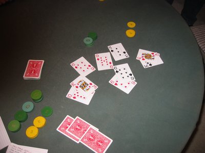![]() Recap One for the HostYour friendly host finally put a tournament in the bag. It took a see-saw heads-up battle with Don Jones, but after 3+ years of tournaments the deed is done.In the final battle, Don and I slugged it out for over half and hour, with the chip lead changing hands 3 or 4 times, a dozen or more all-in moves, and surprisingly two hands that tied. In one case we both held ![]() , the other we had junk cards in the hole and both had to play the board.In the end, my pocket 6s made trips, beating Don's ![]() which paired a on the flop. Had a appeared on the river, the hand would have resulted in the 3rd tie hand.![]() The final hand. ![]() ![]() beats ![]() . |